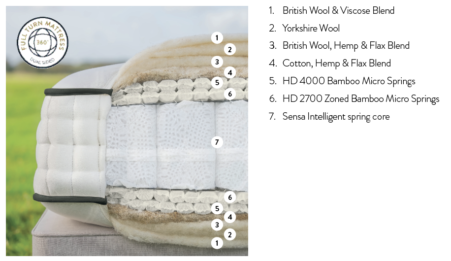 De Malton is voorzien van een 14.000-verensysteem. Aangevuld met meerdere lagen van een mix van Britse wol, katoen, Yorkshire-wol en lokaal geteelde hennep en vlas. De tijk is afgewerkt met een luxueus superzacht aanvoelende, in-house geweven stof zonder chemische behandeling. Het matras is voorzien van 3 rijen gedetailleerde side-stitching.